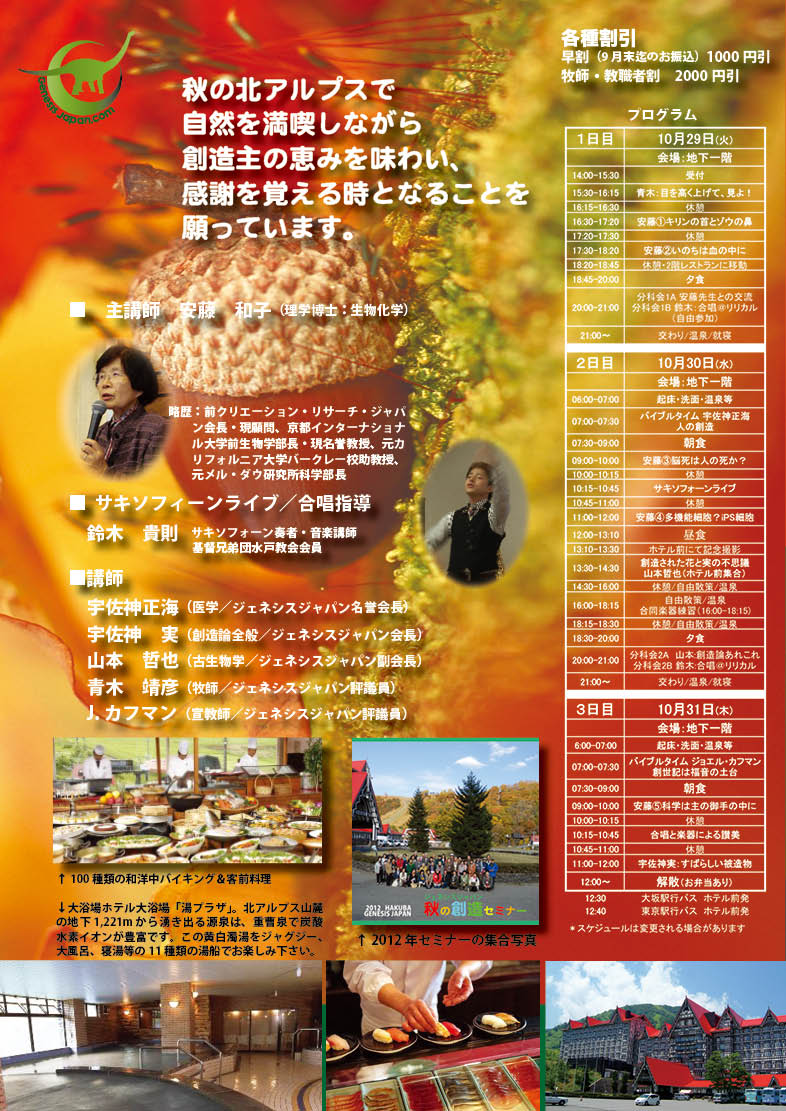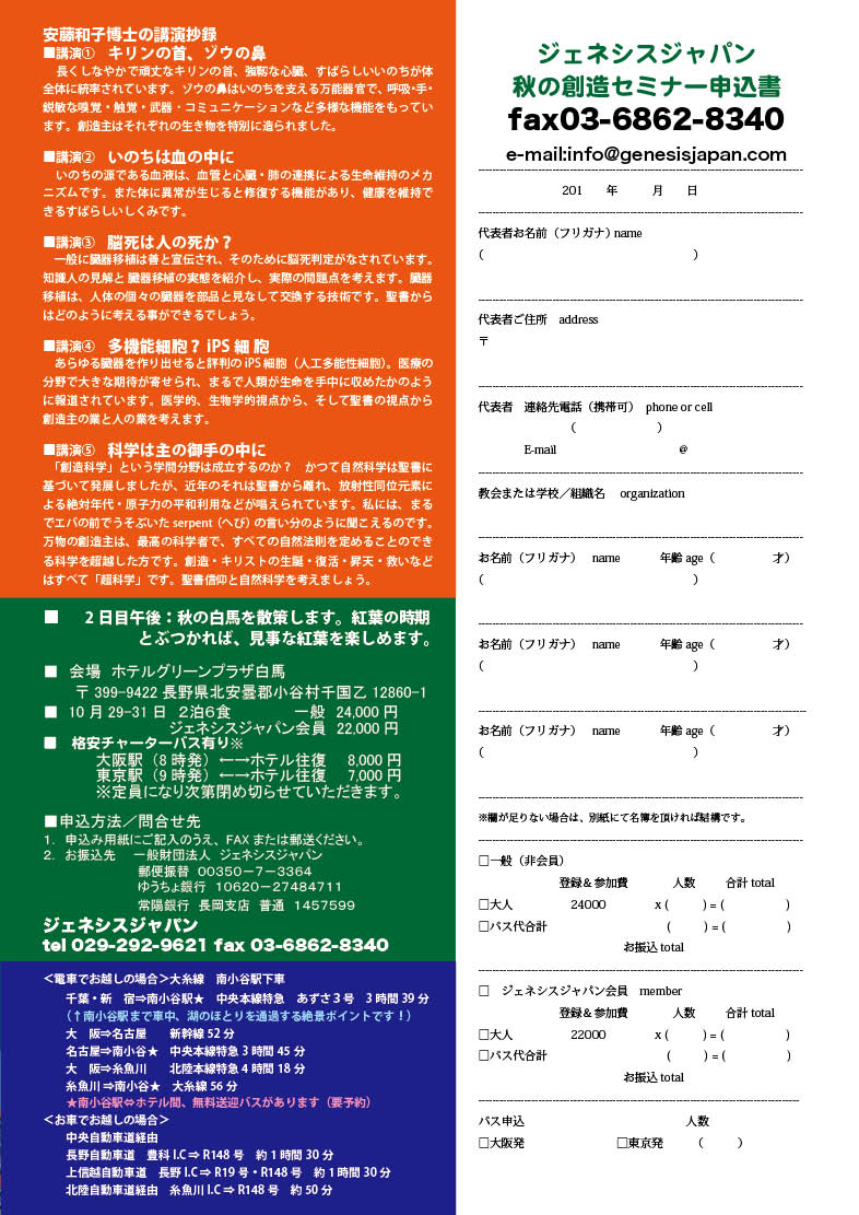 安藤先生の「脳死は、人の死か?」と「iPS細胞」について、改めて恐ろしさを感じました。特に心に残った講演はiPS細胞、キリンの首とゾウの鼻、青木先生の目を高く上げて、山本先生の分科会。毎回新しいことを覚えせていただき感謝しています。ますます声を大して創造主について伝えなければと思いました。三段紅葉、散策ツアーは雨でしたが車窓からのながめでも十分なくらいきれいでした。T・S