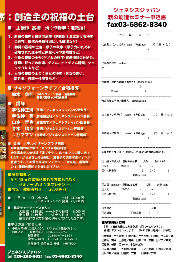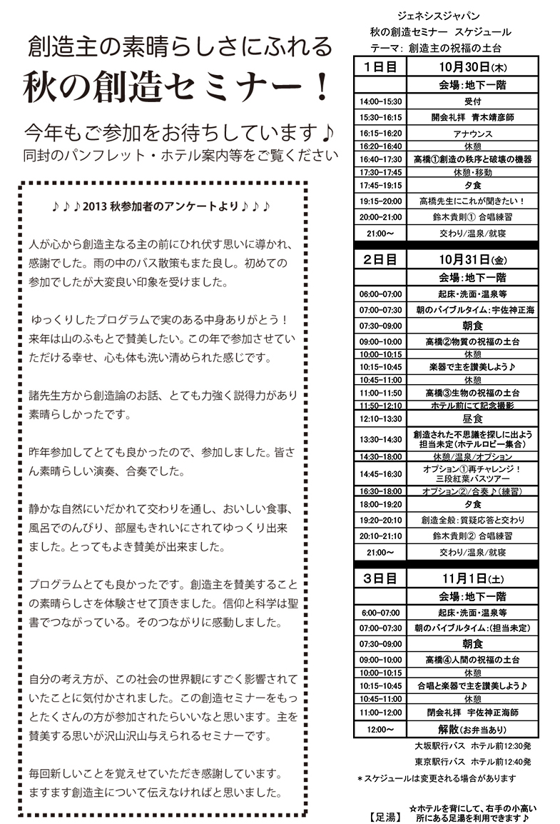 「秋の創造セミナー」の目的は、創造の業を、わかりやすく基本から学ぶことによって、人々が 創造主の素晴らしさを、より深く理解できる機会とするためです。