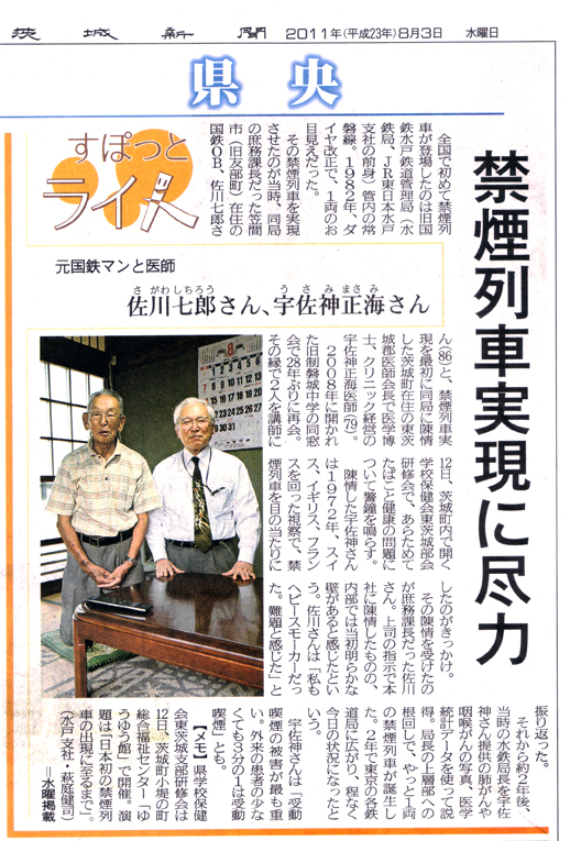 その禁煙列車を実現させたのが当時、同局の庶務課長だった笠間市(旧友部町)在住の国鉄OB、佐川七郎さん(86)と、禁煙列車実現を最初に同局に陳情した茨城町在住の東茨城郡医師会長で医学博士、クリニック経営の宇佐神正海医師(79)。